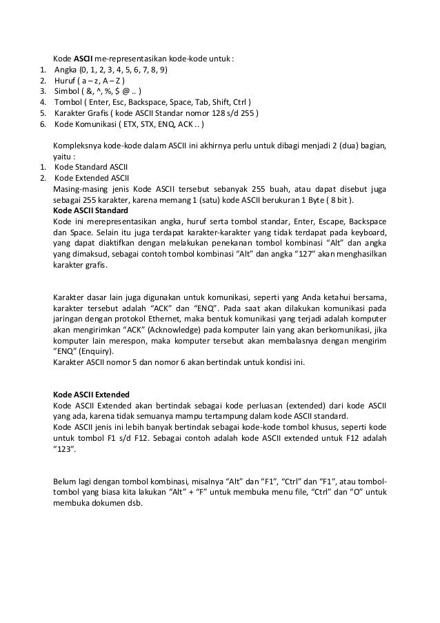 Kode standar amerika untuk pertukaran informasi atau ascii american standard code for information interchange merupakan suatu standar internasional dalam kode huruf dan simbol seperti hex dan unicode tetapi ascii lebih bersifat universal contohnya 124 adalah untuk karakter. Kode yang tidak terlihat simbolnya seperti kode 8 backspace 10 pergantian baris line. Ascii american standard code for information interchange adalah kode standar amerika untuk pertukaran informasi yang merupakan suatu standar internasional dalam kode huruf dan simbol seperti hex dan unicode tetapi ascii lebih bersifat universalkode ascii sebenarnya memiliki komposisi bilangan biner sebanyak 7 bit.